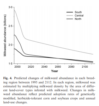 - Milkweed is becoming rare as more land is converted to crop land and as more corn engineered to be herbicide resistant is planted. (Unravelling the annual cycle in a migratory animal: breeding-season habitat loss drives population declines of monarch butterflies, Journal of Animal Ecology 2014, http://norrislab.ca/wp-content/uploads/Flockhart-et-al.-In-press.pdf)