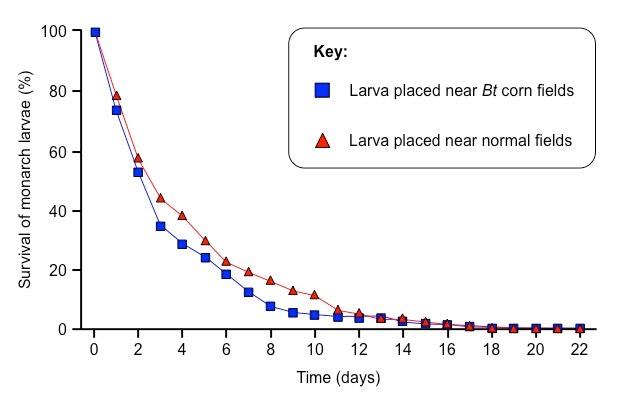 - Field studies compared the mortality of monarch larvae when placed near fields with Bt corn and those without. (Impact of Bt corn pollen on monarch butterfly populations: A risk assessment, PNAS October 9, 2001 https://www.pnas.org/content/98/21/11937)