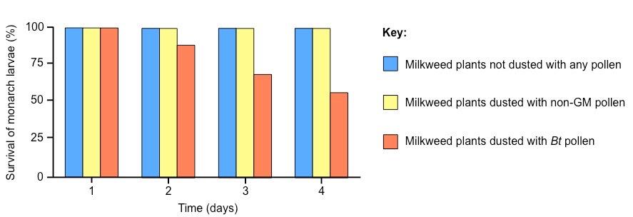 - Laboratory bioassays of pollen fed to first instar monarchs for 4 days on leaf discs or whole detached leaves of common milkweed, A. syriaca, indicate that pollen from Bt corn causes mortality and sublethal effects, such as growth inhibition, at very low concentrations. Mortality was evident, even at low densities of pollen, but was variable (Impact of Bt corn pollen on monarch butterfly populations: A risk assessment, PNAS October 9, 2001 https://www.pnas.org/content/98/21/11937)