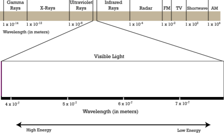 2.9.U2: Visible light has a range of wavelengths with violet the shortest wavelength and red the longest (400-700 nm = visible light. Don’t need to know specific wavelength for each color)