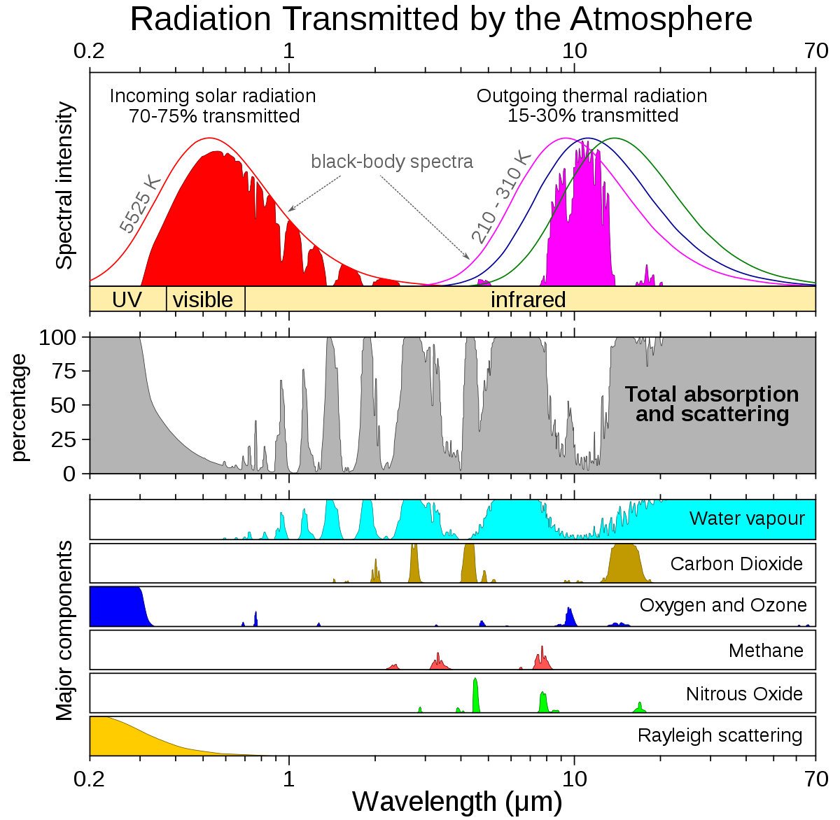 - Long wave radiation from the Earth (peaks at 10,000 nm)
