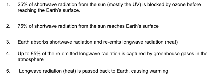 - Explain the greenhouse effect, with reference to short wave radiation from the sun, long wave radiation from the Earth and the effects of ozone and greenhouse gasses.