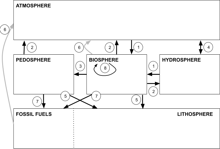 The carbon cycle is the biogeochemical cycle by which carbon is exchanged among the biosphere, pedosphere, geosphere, hydrosphere, and atmosphere of the Earth. Carbon is the main element found in biological compounds as well as a major component of many minerals such as limestone.