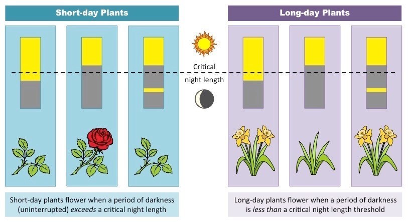 - Compare the timing of flowering in short-day plants and long-day plants.